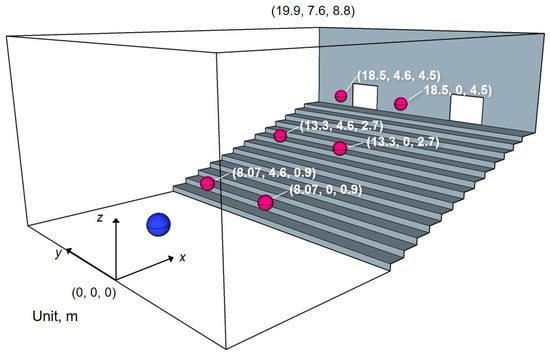 Figure 3 shows an analyzed model for Problem 2, which simulates acoustics in a classroom of 189 m with eight long desks and a platform. Problem 2 has larger dimensions and more complex geometry than Problem 1. A source point and a receiver are placed, respectively, at positions (x, y, z) = (0.5, 3.5, 1.5) and (2.8, 2.0, 1.2). The absorbing condition is the same as that used in Problem 1: ceiling—GW32K; absorbing panel (yellow surfaces in Figure 3)—GW96K; doors and windows—statistical absorption coefficient of 0.05; other surfaces—statistical absorption coefficient of 0.08.