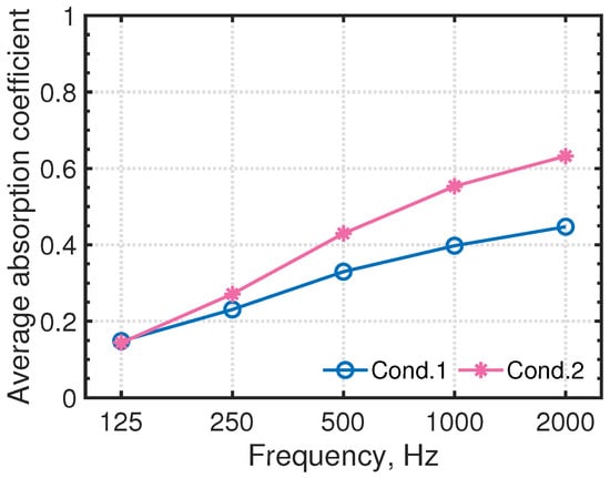 Average absorption coefficients of the auditorium for two absorption conditions.