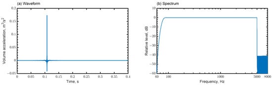 The impulse response of an optimized FIR filter designed with the Parks–McClellan algorithm having a flat spectrum from 80 Hz to 5 kHz was used as a sound source signal. Its waveform and spectrum are presented in Figure 9. This source signal is beneficial for evaluating acoustic parameters and auralization purposes compared to a well-used Gaussian pulse having a non-flat spectrum. The auditorium model was spatially discretized by various-sized 8-node hexahedral FEs having edge lengths of less than 0.015 m. The resulting FE mesh has 742,561,152 elements and ensures spatial resolution of 4.6 elements per wavelength at 5 kHz. A theoretical estimation shows the FE mesh can keep dispersion error of less than 1% [9]. After meshing, the computational model is divided into 6144 subdomains by partitioning software Metis [28]. Regarding the reference, the coefficients of variance in DOFs and communication data among subdomains were 0.3% and 11.8%, respectively. Then, the massively parallel wave-based computation was performed with 6144 CPU cores under the same cloud computing environment as that described in Section 3 to simulate the auditorium room acoustics.