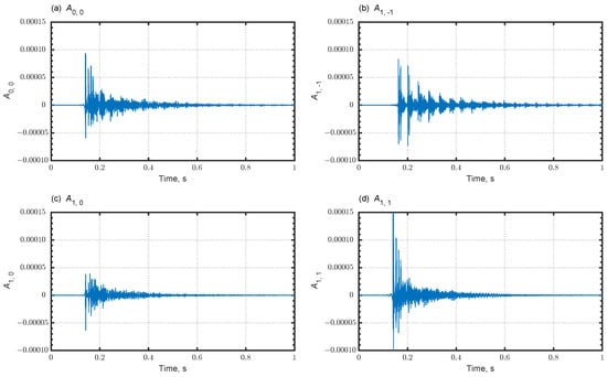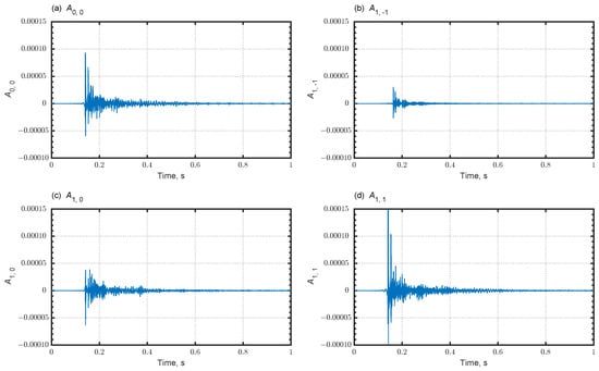 Furthermore, we show room-acoustics evaluation findings related to acoustic disturbance and receiver’s directivity in early and late time, using FOA signals. Figure 10a–d show simulated FOA signals at a receiver R3 of Cond. 1. Here, is the omnidirectional component and , , and are the bidirectional components in y-, z-, and x-directions. A repetition of intense reflected sounds is apparent; it seems likely to promote flutter echoes in because of the low absorptivity of the side walls. Figure 11a–d show FOA signals at R3 for Cond. 2 with additional sidewall sound absorbers. As shown in Figure 11b, adding sidewall sound absorbers decreases repetition of intense reflected sounds, thereby suppressing flutter echoes. The contribution of adding sidewall sound absorbers is also apparent for the other components. Naturally, the direct sound shows the largest amplitude for the component , which is the bidirectional component in the x-direction, compared to other components.
