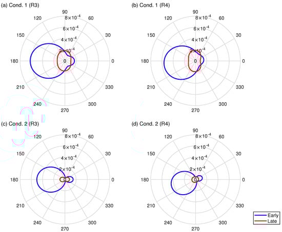 Figure 12a–d further show the receiver’s horizontal directivity in early and late times at R3 and R4 for Cond. 1 and Cond. 2. The horizontal directivities are defined here as the summation of incident plane wave energy calculated using