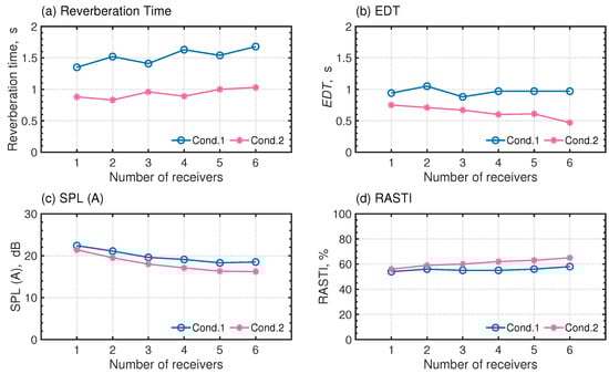 Acoustic parameter: (a) reverberation time; (b) EDT; (c) SPL (A); and (d) RASTI.