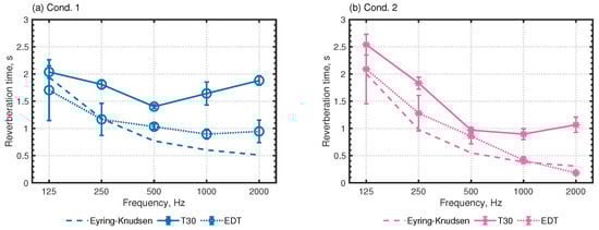 Comparisons of reverberation properties in the auditorium calculated using the Eyring–Knudsen formula and the wave-based solver: (a) Cond. 1 and (b) Cond. 2.