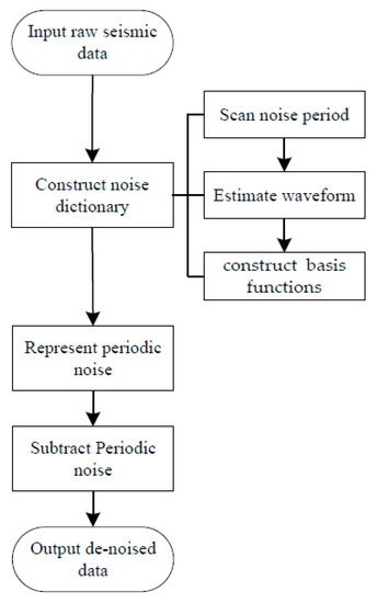 Periodic noise is recurring in raw seismic data, and its amplitude is constant within the recording time [6]. Based on these characteristics, we can differentiate and estimate periodic noise from ambient noise. Because ambient noise, such as periodic noise, white Gaussian noise and other non-stationary [1,18] random noise, is ubiquitous in seismic records before the first arrivals, we can extract noise features and construct the noise dictionary from it. The algorithm is outlined in the flow skeleton (Figure 1).