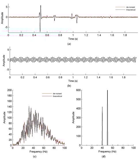 A synthetic signal is shown in Figure 8a, where the main noise is stationary and the waveform is recurring except for weak white Gaussian noise. The eliminated noise and de-noised signal are shown in Figure 8b,c, respectively. Their amplitude spectra are shown in Figure 9. Both the time sequence and amplitude spectrum of the de-noised signal are consistent with the theoretical signal. Because the amplitude spectrum is complex, it is hard to estimate its amplitudes, frequencies and phases, which are important for model-based approaches [8,9]. Therefore, the proposed method can effectively attenuate the multitoned noise and even periodic noise with a complex waveform but not influence the seismic events.