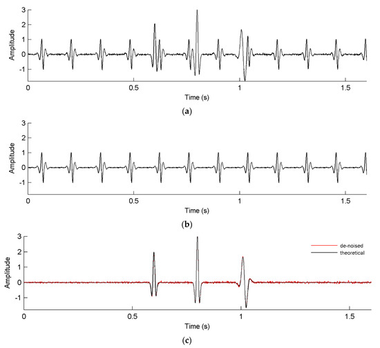De-noising result of the synthetic noisy signal. (a) Noisy signal, (b) eliminated noise and (c) de-noised signal. The de-noised signal is shown as a red line and the theoretical signal as a black line in (c).