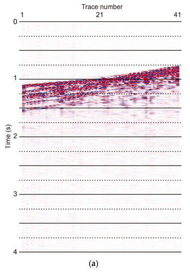 The proposed method was tested using field data. The field data are a land seismic shot recorded with a 2 ms sample rate and a 40 m geophone interval, as shown in Figure 10a. The data contain periodic noise which may be caused by power lines, engine operation and other interferences. The noise is so strong that it affects the quality of the subsequent processes, especially for the first 12 traces. As shown in Figure 10c, we cannot see any waves after the time 1.5 s. There are three horizontal bands around the frequencies of 7 Hz, 14 Hz and 50 Hz in the f-k domain (Figure 10b). The periodic noise at the frequency of approximately 14 Hz, highlighted in Figure 10b, is the weakest, and the periodic noise at the frequency of 50 Hz is the strongest.