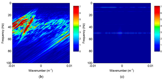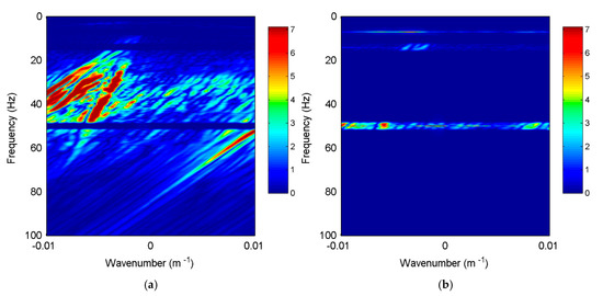 The notch filtering method is applied to the field data for a comparison. The narrow stop band of the notch filter is the frequency range , where is the noise frequency and is the noise bandwidth. The values of for the three noise bands are set to 7 Hz, 14 Hz and 50 Hz, respectively. The noise bandwidth is estimated to be 2 Hz and is set. The f-k spectra of the filtering result are shown in Figure 13. The horizontal bands around the frequencies of 7 Hz, 14 Hz and 50 Hz are separated from the seismic data. However, the seismic waves are also eliminated at those frequencies. This causes spectral notches of seismic waves (Figure 13a). To further show the effectiveness of our method, the spectra of the single-trace de-noised signals by the two methods are compared in Figure 14. For the notch filtering method, the spectral notch causes amplitude loss of seismic events around the frequencies of 7 Hz, 14 Hz and 50 Hz. However, amplitude loss does not occur using our proposed method. The eliminated noise (Figure 15a) is stationary. This is consistent with the characteristics of periodic noise caused by the power lines or engine operation. For comparison, the noise eliminated by the notch filtering method is not stationary because it contains seismic signals.