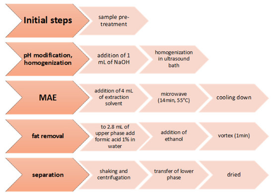 Snamina M. et al. have developed a method for the quantification of antidepressants in human bone marrow aspirated. This method has provided microwave-assisted extraction that includes several steps, illustrated in Figure 2, after which the analysis was conducted in UHPLC-TOF-MS [74].