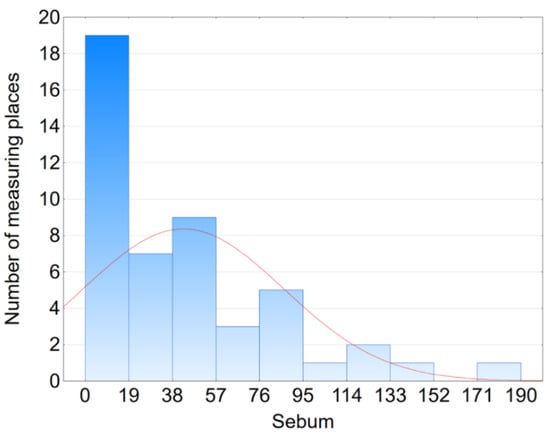 The results distribution of the amount of skin sebum is shown in Figure 1. The values of the median (Me) and the quartile range (25–75%) of the amount of skin sebum were 35.50 and 6.00–66.00, respectively.