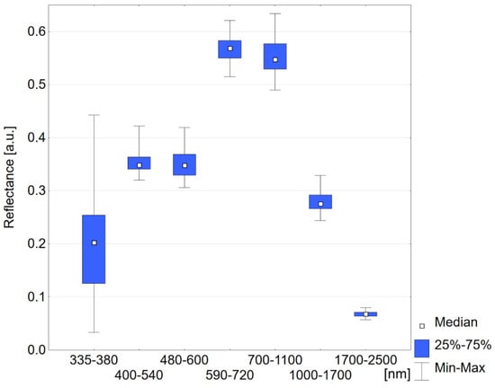 The directional reflectance of the skin significantly differed depending on the wavelength range (p < 0.0001) (Figure 2). The skin was characterized by the highest reflectance value at wavelength ranges 590–720 nm and 700–1100 nm; reflectance at these two ranges did not differ significantly. Compared to the reflectance values at other wavelength ranges, reflectance at 590–720 nm and 700–1100 nm was significantly higher (p < 0.05). The skin reflectance values at 400–540 nm and 480–600 nm did not differ significantly, but compared to the higher and lower wavelength ranges, the observed reflectance differences were significant (p < 0.05). The skin reflectance at wavelength range 1000–1700 nm differed significantly from the reflectance at other spectral ranges except 335–380 nm. The skin reflectance at 1700–2500 nm was the lowest and differed significantly from the reflectance at other spectral ranges except for 335–380 nm.