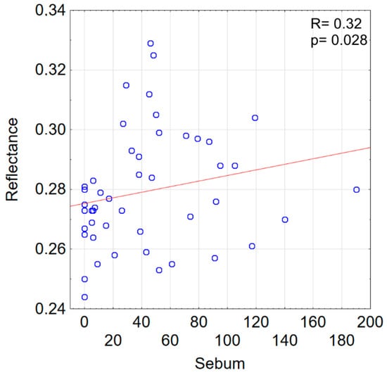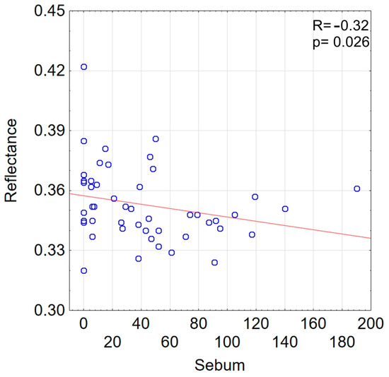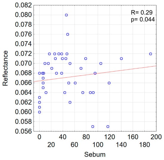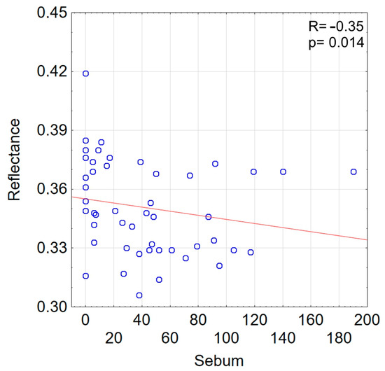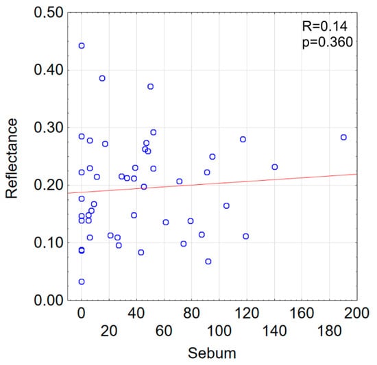 Spearman’s rank correlation analysis between the amount of sebum and the value of directional reflectance of the skin measured at the wavelength 335–380 nm showed no statistically significant relationship between the two variables (R = 0.14; p = 0.360) (Figure 3).