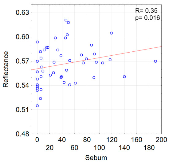 In conclusion, correlations between sebum content and reflectance were initially determined. Nevertheless, the coefficient is not high and further research is needed to verify the obtained results with a larger number of volunteers of different ages, sex, and phototypes.
