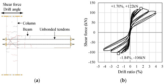 Focusing on the postearthquake repairability of the structures and continuity of the building operations, the prestressed precast RC structures (donated by PC structures in this work) will be one of the promising options. For the PC structures, the beam–column connection containing debonded prestressed steel tendons has been proposed by Priestley et al. [16,17,18]. The PC beams are connected to the multistory RC columns with prestressing tendons, which are debonded in a certain region. The deformation of the debonded PC connection is characterized by the near-rigid rotation of the PC beam and column members around the contact interface, and the crack openings are formed due to the separation at the beam–column interface. Therefore, the deformation of the debonded PC frames is mainly concentrated at the crack openings, while the deformation occurring on the beam and column members is relatively small. Meanwhile, because the strain in the tendons is uniformly distributed along the debonded length, the tendons remain within the yield limit, even when large deformations occur in the buildings. Due to these characteristics, the debonded PC frame can achieve self-centering even against strong earthquakes, while the damage to the PC beam and column members is quite minor. These advantages have been demonstrated by cyclic loading tests on beam–column connection subassemblages [18,19,20,21,22], shaking table tests on frames [23,24], as well as numerical simulations [25,26,27]. These advantages are expected to benefit the postearthquake repairability and continuous operation of the structure. Figure 1 gives the final damage map and the load–deformation relationship of a debonded PC subassemblage specimen representing an exterior beam–column connection tested by the authors [28], where it can be observed that only slight damage is generated on the specimen and the residual deformation is very small after a large deformation drift of 4%. Previous researchers have also applied similar connections with debonded tendons to other types of structural components, including concrete rocking walls [29,30,31,32,33,34], coupling beams between shear walls [35,36], rocking steel braced frames [37,38,39,40], beam–column connections in steel moment frames [41,42,43,44], rocking cross-laminated timber (CLT) panels [45,46], laminated veneer lumber (LVL) panels [47,48], and masonry walls [49,50]. All of these structural components were found to exhibit superior self-centering and low damage characteristics from the experimental studies.