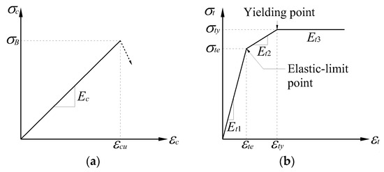 The PC members considered in this study are made of high-strength concrete. When the concrete strain is less than the ultimate limit εcu, the stress–strain relationship is approximately linear, as shown in Figure 4 [28,60]. Therefore, the linear constitutive model shown in Figure 5a is employed for the high-strength concrete, and the elastic stiffness Ec is defined as the ratio of compressive strength σB to εcu. Meanwhile, the trilinear constitutive model in Figure 5b is employed for the tendons, where the elastic limit point (εte, σte) separates the elastic stage and the stiffness decreasing stage, while the yielding point (εty, σty) separates the stiffness decreasing stage and the postyielding stage where the stiffness is very small. The two points can be determined from the tensile test of tendons, where the elastic limit point and the yielding point are obtained by 0.01% and 0.2% offset methods, respectively [61]. This trilinear model can reflect the gradual degradation of tendon stiffness from the elastic stage to the postyielding stage. Based on the trilinear constitutive model, the equations for tendon tensile force Tt can be obtained as follows.