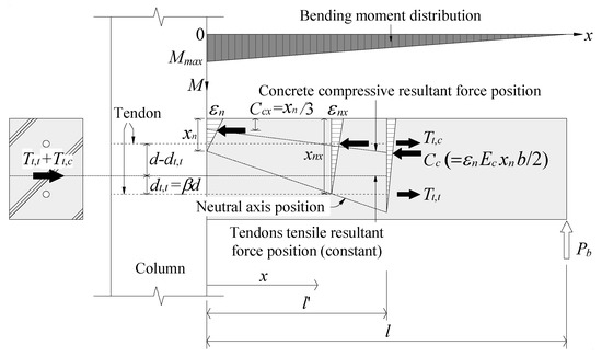 At the inflection point of the beam, only the shear force acts at the beam section. This is simulated by applying the concentrated force Pb at the beam end of the subassemblage, as shown in Figure 7. In this case, the bending moment at each section of the beam is linearly distributed, which is zero at the inflection point and maximum at the beam–column interface. Because the tendons are debonded, their tensile resultant force (Tt,c + Tt,t) and position dt,t are constant at any section within the PC zone. As such, the distance between the tensile resultant force and the concrete compressive resultant force (Cc) must vary linearly within the PC zone, and consequently distribution of the distance from the ultimate compression fiber to Cc (Ccx) should also be linear.