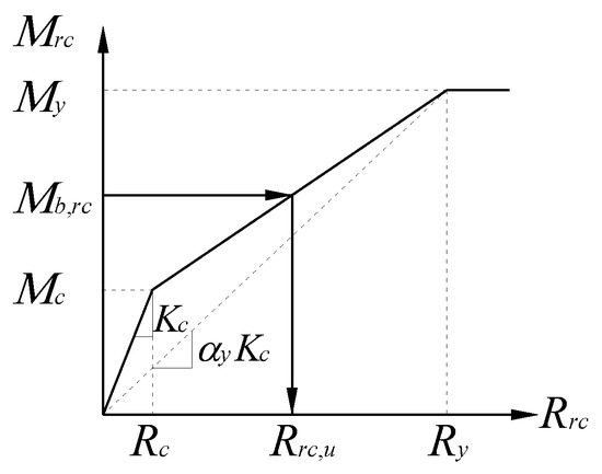 On the other hand, the beam deflection angle of RC zone, Rrc,u, is calculated from Equation (12) based on the trilinear bending moment–deflection angle relation shown in Figure 8 [62].