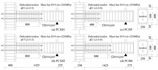 Two PC beam–column subassemblage specimens (PCJ05, PCJ06) and two PC cantilever beam-type specimens (PCX01, PCX02) tested by the authors [28,60] are presented here. The details of the specimens are shown in Figure 10, and their properties are briefly summarized in Table 1. The test setup of the specimens is given in Figure 11. The precast RC column and beam members were fabricated independently, and they were attached by the interface mortar. The posttension force was then applied to the debonded partial tendons. Specimen PCJ05 has the shortest tendon length, while the other specimens have almost the same tendon length. The initial prestressing ratio (λ), which is the ratio of the total initial prestress force ΣTt0 to the total yielding force ΣσtyAt of the tendons, ranged from 0.5 to 0.8. As shown in Figure 11a, the PC beams of specimens PCX01 and PCX02 were set vertically, and cyclic loads were applied to the inflection point. A linear slider and a pin-connecting device were attached to the loading point to ensure simple horizontal loading. Peak drift angles of 0.1, 0.2, 0.4, 0.67, 1.0, 2.0, 3.0, 4.0, and 5.0 percent were included by the loading plan, and two cycles were loaded for each peak drift angle. For the subassemblage specimens PCJ05 and PCJ06 shown in Figure 11b, the beam members were supported by a horizontal roller, while the bottom of the columns was supported by a universal joint. The horizontal cyclic load and the constant axial compressive load (axial compression ratio of 0.09) were applied at the top of the columns through a tridirectional joint by three oil jacks. The specimens were loaded for two cycles with peak drift angles of 0.25 and 0.5 percent, and for three cycles with peak drift angles of 1.0, 1.5, 2.0, 3.0 and 4.0 percent, successively.