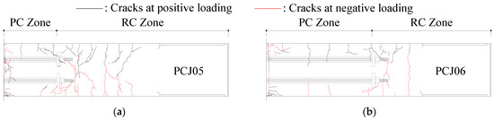 For all the specimens, the flexural failure begins from the cover concrete spalling occurring at the beam–column interface, at which the PC connection reaches its maximum strength. The yielding of longitudinal reinforcement did not occur in either the PC or RC zones. Crack maps of the beams in specimens PCJ05 and PCJ06 after the final peak drift angle are presented in Figure 12. The crack positions and the lengths were traced from the photographs taken in the tests. The crack widths were also measured visually with a crack scale.