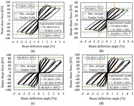 The evaluation accuracy of the iterative procedure is verified by the corresponding test data. The test and evaluation results of the beam shear force (Pb,u), the beam deflection angle (Rb,u), and tendon strains (εt,c and εt,t) were compared in Figure 12 and Figure 13. In the legend of Figure 14, (+) and (–) represent the values at the positive and negative loadings. To measure the tendon strains εt,c and εt,t, strain gauges were attached to the tendons at the beam–column interface. The test data at both the positive and negative loadings are compared with the evaluation results. For the ultimate shear force Pb,u, the evaluation errors of the iterative method are within 10%.