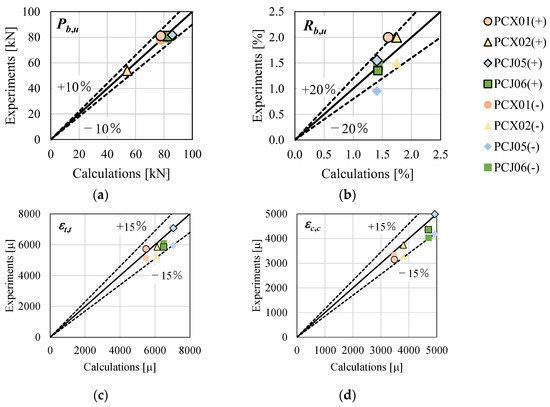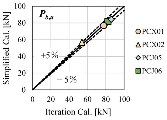 It is noted that the test results of Pb,u for PCX01, PCJ05, and PCJ06 do not show much difference. The average Pb,u of the positive and negative loadings for the three specimens are 79.5 kN, 82.0 kN, and 80.2 kN, respectively. Although the evaluation results of Pb,u seem to have larger variation than the test results, the evaluation errors relative to the average Pb,u are within 5%. In addition, the test results of Pb,u increase in the order of PCX01, PCJ06, and PCJ05, and the same order could be found in the evaluation results. Therefore, the evaluation results exhibit good agreement with the test results.