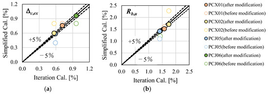 Evaluation accuracy of Δc,ex and Rb,u by simplified method before and after correction: (a) Dc,ex; (b) Rb,u.