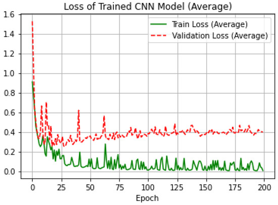 Figure 5 shows a graph of the training and validation accuracy over different training epochs. These values were obtained by averaging the 50 models as mentioned previously. The training and validation loss is shown in Figure 6.