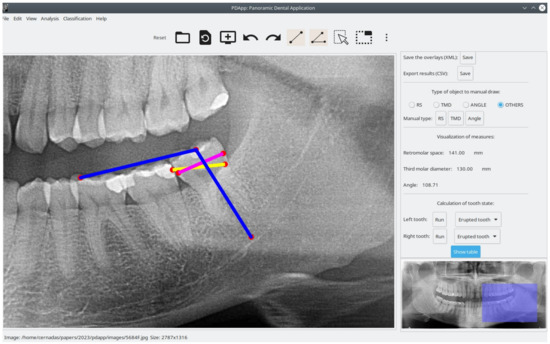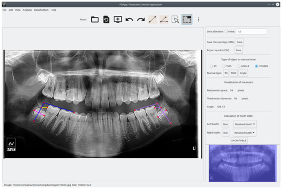 Once the image is loaded, the user must manually draw the retromolar space, the third molar diameter, and the angle using the editing tools. Next, the classifier can be run in order to label each third molar as erupted or non-erupted/retained. As mentioned in Section 1, our previous studies [20,21], and other published research [22], the retromolar space, third molar diameter, and third molar angulation are the key parameters in predicting third molar eruption/retention. Specifically, we used the angle and the radiological retention coefficient (RRC), defined as the ratio of the retromolar space and third molar diameter, because both measures are independent of the spatial resolution at which the radiological image is acquired [20].