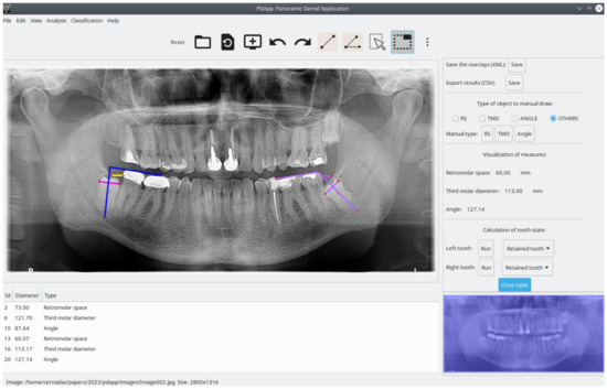 Panoramic Dental Application (PDApp) is a desktop tool that runs on a general-purpose computer under the Linux and Windows operating systems. It was written in the C++ programming language using the GIMP Tool Kit (GTK+) library (https://www.gtk.org/ (accessed on 16 February 2023)) to develop the GUI. Figure 1 shows the GUI of PDApp with a typical radiological image loaded, processed, and reviewed by a dental expert and with the lateral panel displayed.