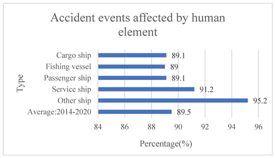 Despite this, among the factors that can cause maritime accidents, the human factor remains the dominant one. The annual overview report of marine casualties and incidents (2021) [8] released by the European Maritime Safety Agency (EMSA) indicates that 89.5% of safety issues are affected by the human element (Figure 1). This percentage is 89.1% for cargo and passenger ships is, while it is 89% for fishing vessels. Note that being affected by the human element does not mean that the human element is solely responsible for casualties or incidents but that it is present. Strictly speaking, maritime accidents are not caused by one factor but by a series of factors. However, only human factors are considered herein as the EMSA report reveals that the human element deeply impacts ships’ safety. Currently, the maritime industry is pushing to improve safety and efficiency [9], which may be another reason why the human element has recently come into focus.