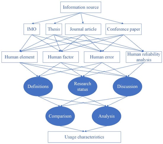 Systematic research was performed on the three terms to conduct the identification process. A large amount of information, articles, and dissertations were collected for analysis, and the procedures are shown in Figure 2. The information sources included IMO documents, dissertations, journal articles, and conference papers. The collected information was divided into four categories: human element; human factor; human error; and HRA. The principle behind dividing the terms is found in Section 2.2. Subsequently, we analyzed the definition and research status of each part and discussed the relevant boundaries. Finally, a comparative analysis was conducted based on the above information.