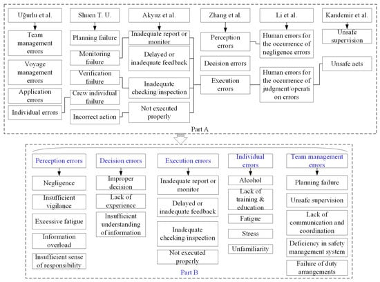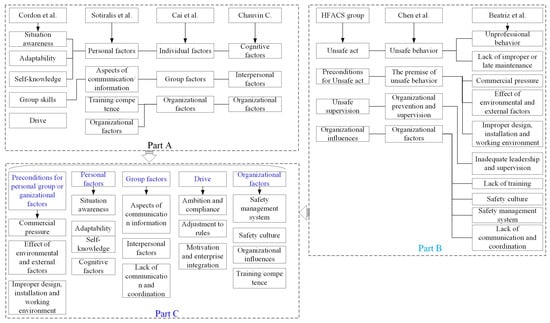 Unlike the human factor, a neutral term, human error, as its name implies, focuses on errors. Section 3.3.2 summarizes a thorough study of the relevant articles. Part A of Figure 5 shows the collected research models and the contents of human error. Moreover, there are few connections between the different models. This research intends to pass judgment without omitting human error content. Part B of Figure 5 displays the results.