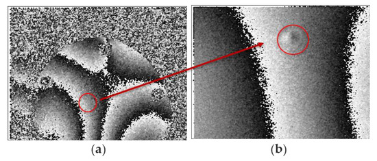 Figure 7a, was very unclear because the large magnitude of the load caused the fringes to be too dense; as a result, it cannot be used to calculate the deformation. However, under the small field of view, the phase map, shown in
