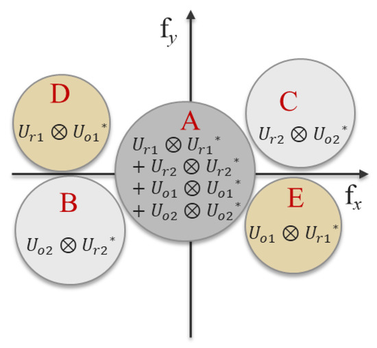 Figure 3 shows a sketch of the Fourier spectrum of the intensity images. Five spectra are distributed on the Fourier domain, corresponding to the eight terms in Equation (12). Sections A contains