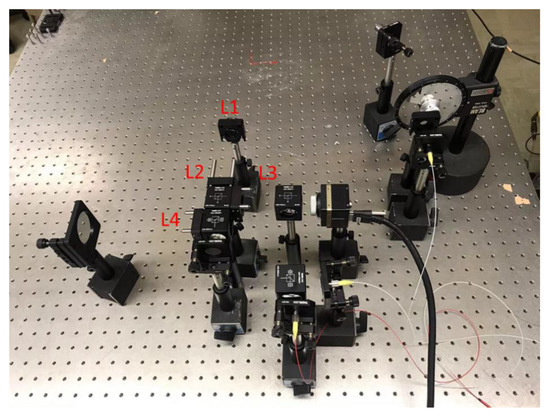 Figure 4 shows a simultaneous dual-spatial-resolution digital holography measurement system. This system utilizes a Verdi G5 laser as well as a 2453 × 2056-pixel grayscale CCD camera. The pixel sizes of the CCD camera in the horizontal direction and the vertical directions are both 3.45 µm. L1, L2, L3, and L4 are the lenses. The focal lengths of the imaging lens, L1, is 35 mm (f