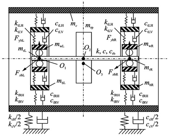 Some types of fault samples may be missing during the fault diagnosis of mechanical equipment. To simulate this type of situation and obtain the lacked fault samples, the concentrate quality standard was established with the rolling bearing fault of the rotor-bearing-casing coupling system dynamics model. This was followed by the establishment of the dynamic model of the rolling bearing fault and the construction of the lack of fault samples. As shown in Figure 1, a simulation model made up of a rotor, bearing, bearing seat, shaft, and other parts are depicted. The bearing inner ring remains connected to the bearing housing while the shaft moves. Suppose the stiffness and damping of the primary components are not changed numbers and the left bearing occurs faults, six differential equations of motion pertaining to the left support bearing can be listed [17]: