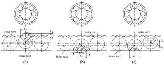 A schematic illustration of a bearing with a localized defect area is shown in Figure 2 on the ball, inner ring, and outer ring components. The cyclically varying contact forces and are the sum of the contact forces of the balls at different angles: