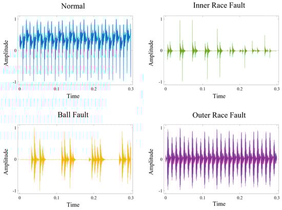 The simulation model adopts a SKF6203 bearing and its main parameters are listed in Table 1. The damage diameter LD is set to 0.3556 mm, the damage depth a is set to 2.794 mm, the rotational speed is 1797r/min, and the sampling frequency is set to 10 kHz. Figure 3 shows a time-domain waveform diagram of the vibration acceleration signal collected by the left support bearing under four different health states.