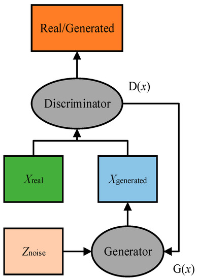 The Generator (G) and Discriminator (D) are the two components that make up the GAN structure, as shown in Figure 4. A random noise vector is utilized as the input of the G, which attempts to create realistic data to deceive D. The D then learns to distinguish between actual data and G-produced synthetic data. Typically, G and D are constantly optimized to enhance their ability to generate and discriminate data, and they are often parameterized as deep neural networks and optimize a mini-max objective. The training objective function of the GAN is displayed as follows: