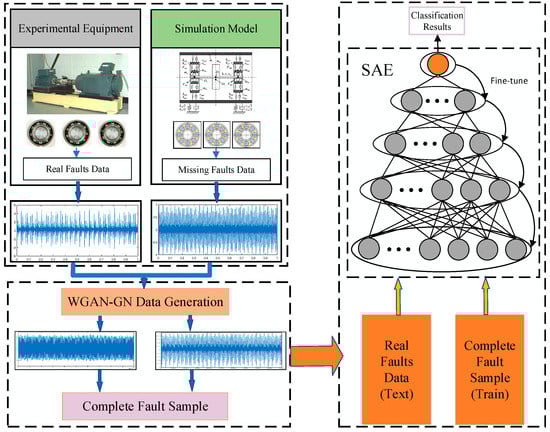 To resolve the above deficiencies, a new model-based GAN and dynamic simulation model of fault bearing is proposed in this paper for rotating machinery under missing fault samples. Firstly, to obtain vibration responses of bearings in various states and get the missing fault samples, a rotor-bearing system simulation model is developed. Secondly, gradient normalization (GN) [15,16] is adopted to enhance the feature learning ability of the Wasserstein generative adversarial network (WGAN). The proposed WGAN-GN is used to generate samples for the fault types, and then the generated samples are combined with the original samples into a complete dataset. Next, a stacked autoencoders (SAE) model is employed to extract advanced features from the complete dataset and achieve accurate fault classification. Finally, the viability and robustness of the proposed method are confirmed by several experimental instances. The following is a summary of the main contributions: