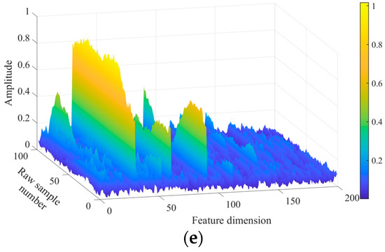 Extracted features of generator for RF samples: (a) The first layer, (b) The second layer, (c) The third layer, (d) The output layer, (e) The raw sample.