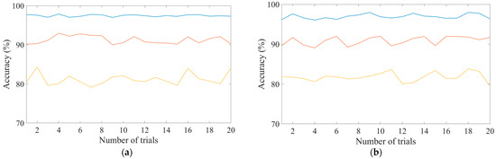 Accuracies of the two datasets using the three methods: (a) Dataset A, (b) Dataset B.