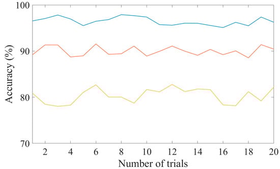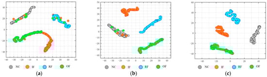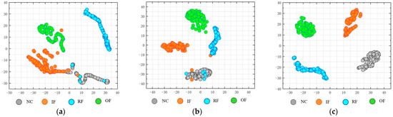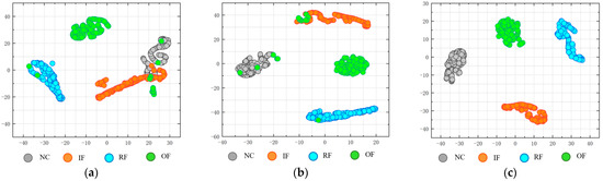 Figure 15 displays the findings of the diagnosis accuracy test. For Dataset C, the average accuracies of the three methods are 81.37%, 90.00%, and 96.48%, respectively, with 1.61%, 1.01%, and 0.85% as their standard deviations. The proposed approach continues to offer maximum degree of diagnostic accuracy when compared to other methods. Furthermore, Figure 16 displays the outcomes of the dimension reduction. It is concluded that the proposed model greatly outperforms them in terms of clustering and classification compared to the other two methods. It also proves that the obtained simulation signal can replace the real measured signal to a certain extent for fault diagnosis at the same time.
