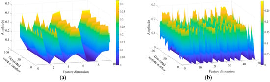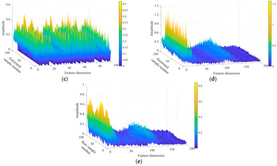 Figure 13 gives the comparison result of Dataset C. It is obvious that the trends of the generated samples and the raw samples are very similar, and the features in the generated samples have basically the same distribution as the features in the raw samples. By contrasting the generated samples with the original samples of 3D plots, RF samples are chosen to investigate the feature extraction capability of WGAN-GN. According to Figure 14, the simulated signals generated by WGAN-GN has nearly identical properties to the original samples.