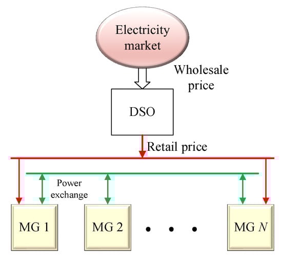 As an important subject of integrated distributed renewable energy [22], the power exchange of a MMG at the PCC has great uncertainty, which will impact the distribution network. To this end, this paper constructs a MMG energy management model. The interaction between the MMG and the distribution network is shown in Figure 1. The information is transmitted between the distribution network and the MMG through a two-way communication network. The DSO releases retail electricity prices to the MMG in real time, and each MG feeds back its electricity purchase or sales based on the retail price.