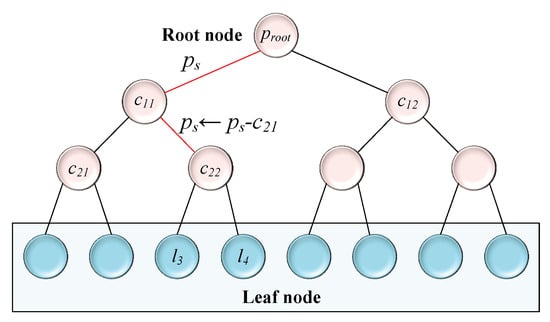 Sample Ns samples in the replay buffer. The value of root node is divided into Ns intervals equally, and one randomly samples in each interval. For a certain sampling value ps, if it is less than the value c11 of the left child node, the path on the left will be followed; otherwise, the path on the right will be followed. If ps < c11, ps is compared with the values of the two child nodes in the lower layer on the left. If ps < c21, the left path will be followed. If ps > c21, the right path will be followed and ps is updated. The new ps is equal to the difference between the original value and the value of the left child node. It will continue according to the above rules until a leaf node is reached. Finally, the experience of the selected leaf node is trained. For the leaf node with priority of pi,n, the probability of being selected is P(n):