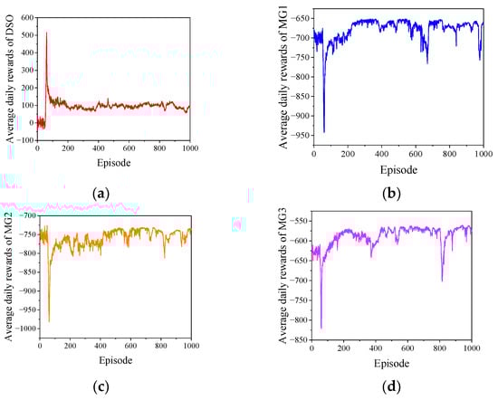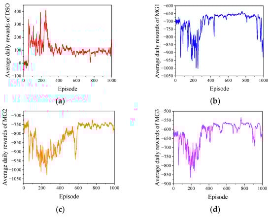 Average daily rewards of multiple agents under PMADDPG algorithm: (a) DSO; (b) MG1; (c) MG2; (d) MG3.