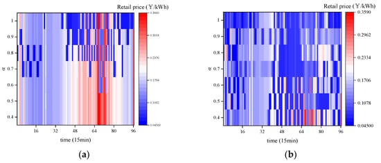 It can be seen in Equation (21) that the weight factor α in the DSO;s reward is used to maintain the balance between the DSO’s profits and the stationary degree of power exchange at the PCC (the stationary degree is the opposite of Equation (3)). The retail electricity price strategy and reward of the DSO agent will be impacted by α. Figure 7 shows the optimal retail electricity price under different α values.