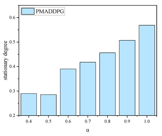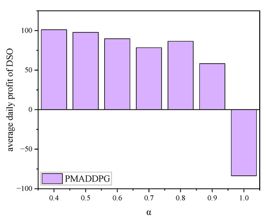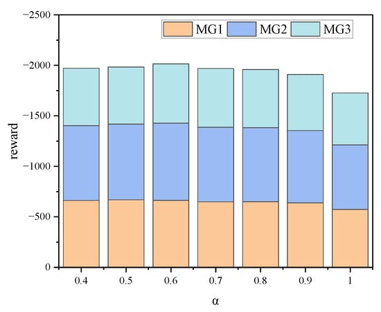 As can be seen in Figure 8 and Figure 9, the increasing α will lead to an increase in the stationary degree and a decrease in the average daily profit of the DSO. This is because with α increasing, the DSO expands the peak–valley difference in retail electricity price to guide the MMG toward more stationary power exchange at the PCC. Figure 10 shows the rewards of MG agents under different values of α.