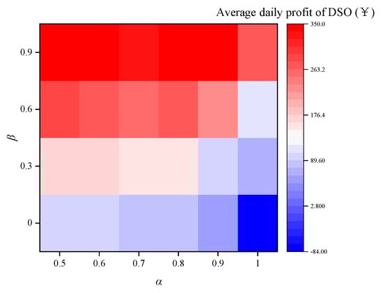 Figure 11 shows the stationary degrees of power exchange at the PCC under different combinations of α and β. Figure 12 shows the average daily profits of the DSO under different combinations of α and β.